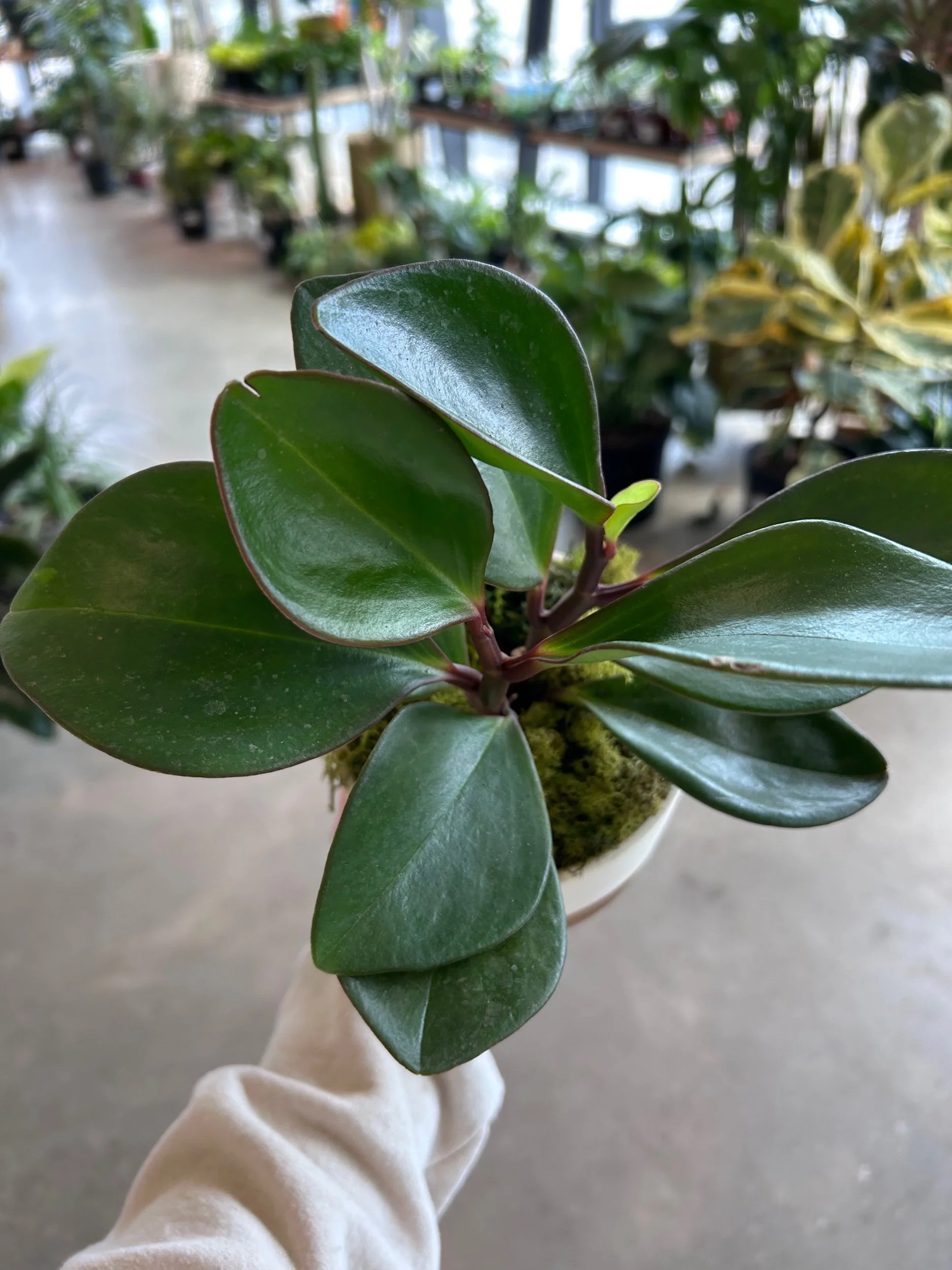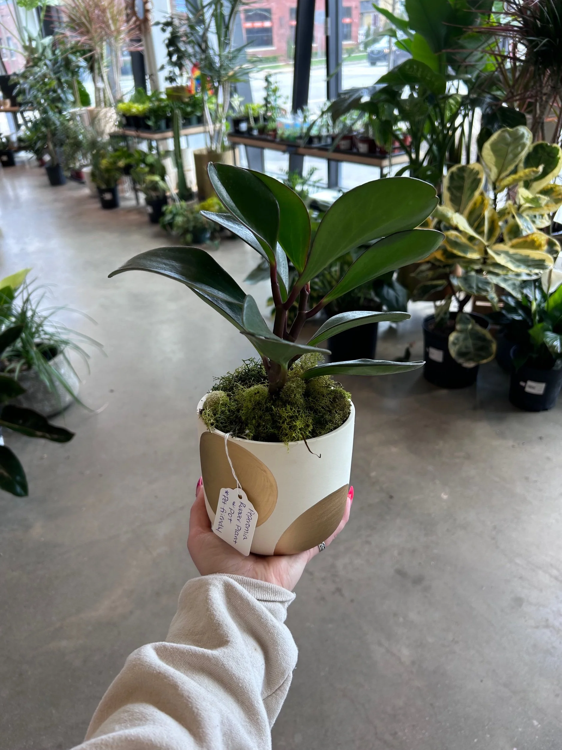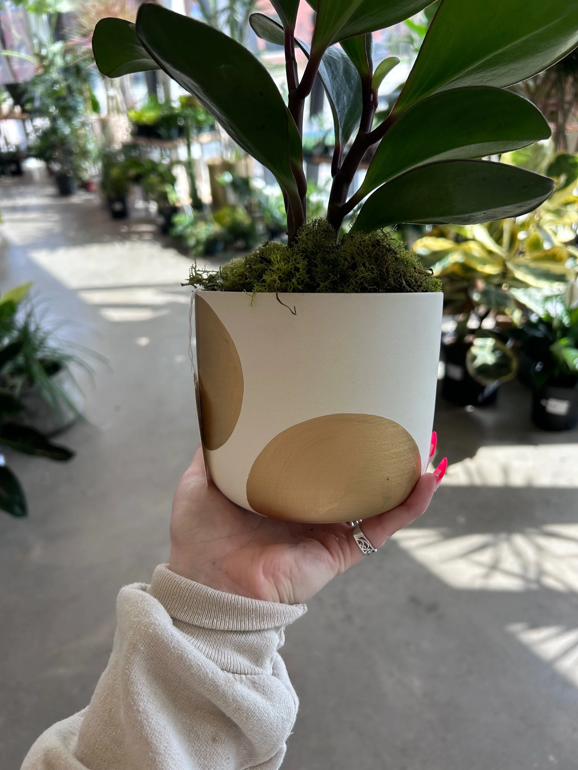 Black Rubber Plant in 4” gold ceramic polka dot planter. Pet-friendly.