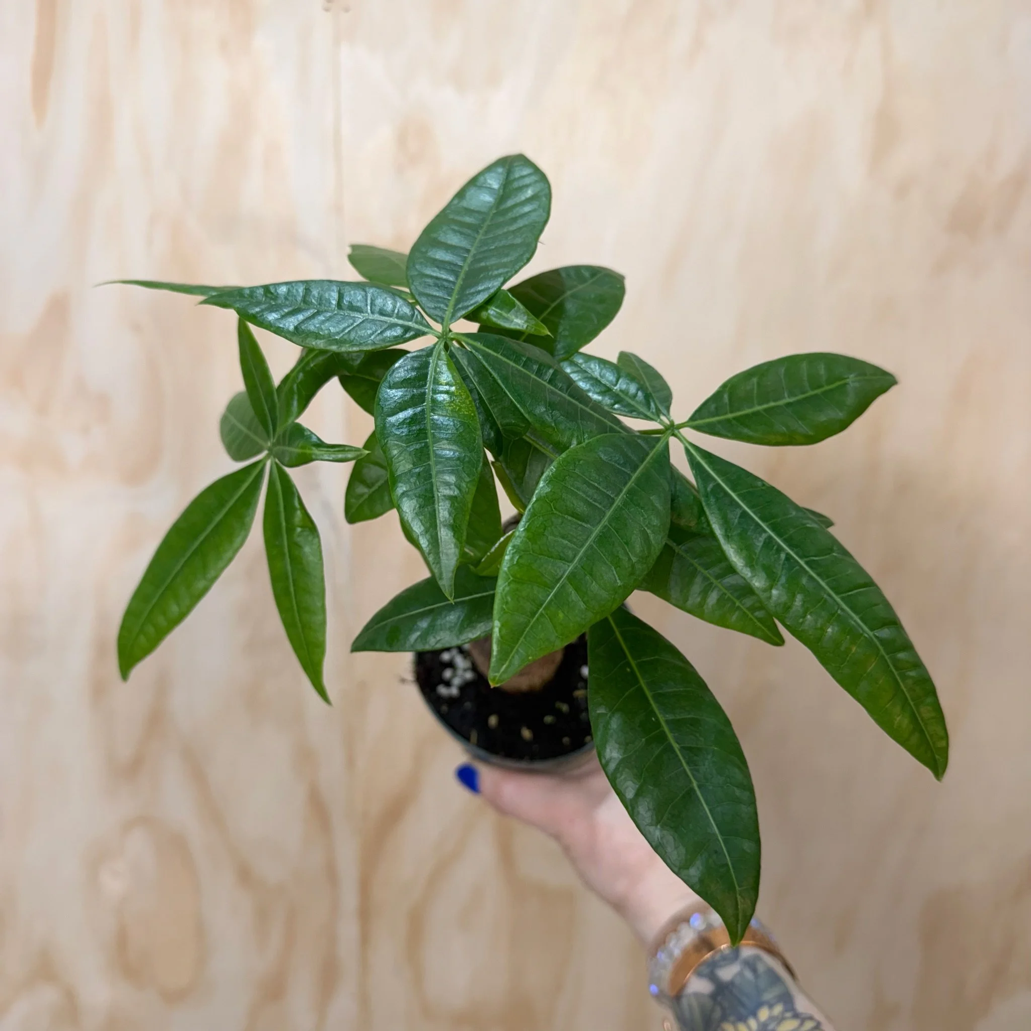 4” grow pot. Nice chunky stem on these beautiful money trees. Pet-friendly.