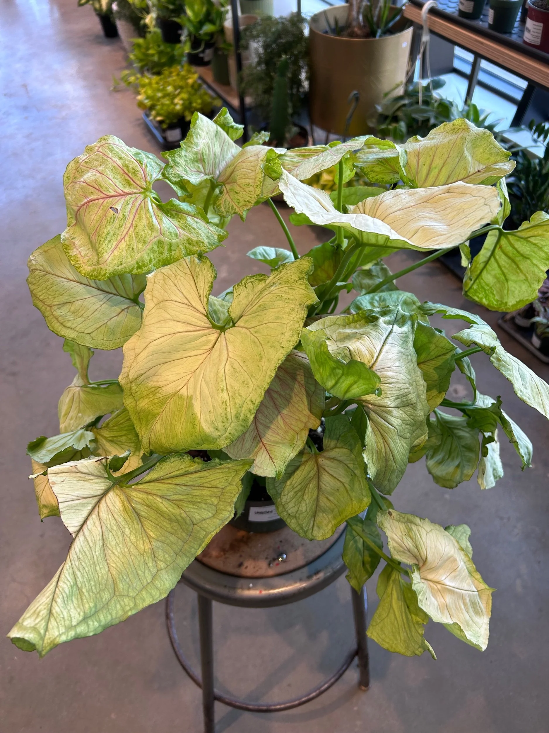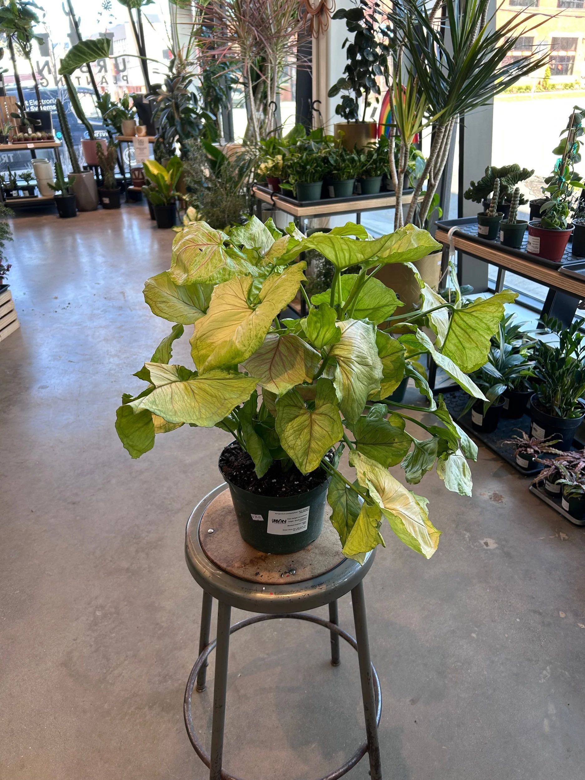8” grow pot. This Syngonium variety has mint green coloring with pink veining throughout.